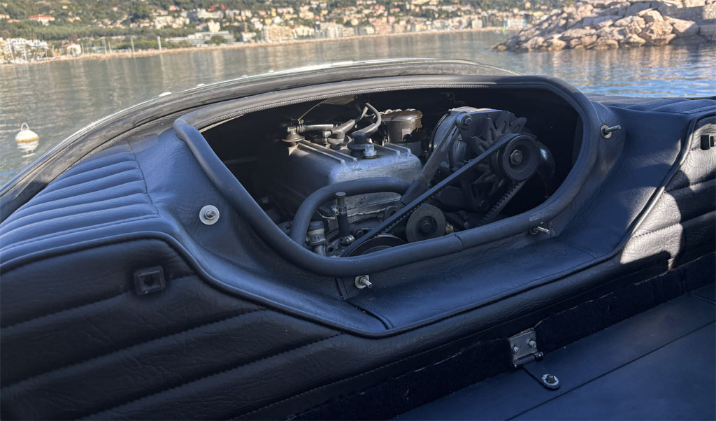 Ralph nous montre le panneau arrière rabattable qui permet d’accéder à un cache démontable pour aller dans la partie avant du moteur. Sur les voitures de course, la custode était démontable. Ici le mécanicien devra avoir des talents de contorsionniste ! C’est aussi le seul emplacement possible pour de maigres bagages :