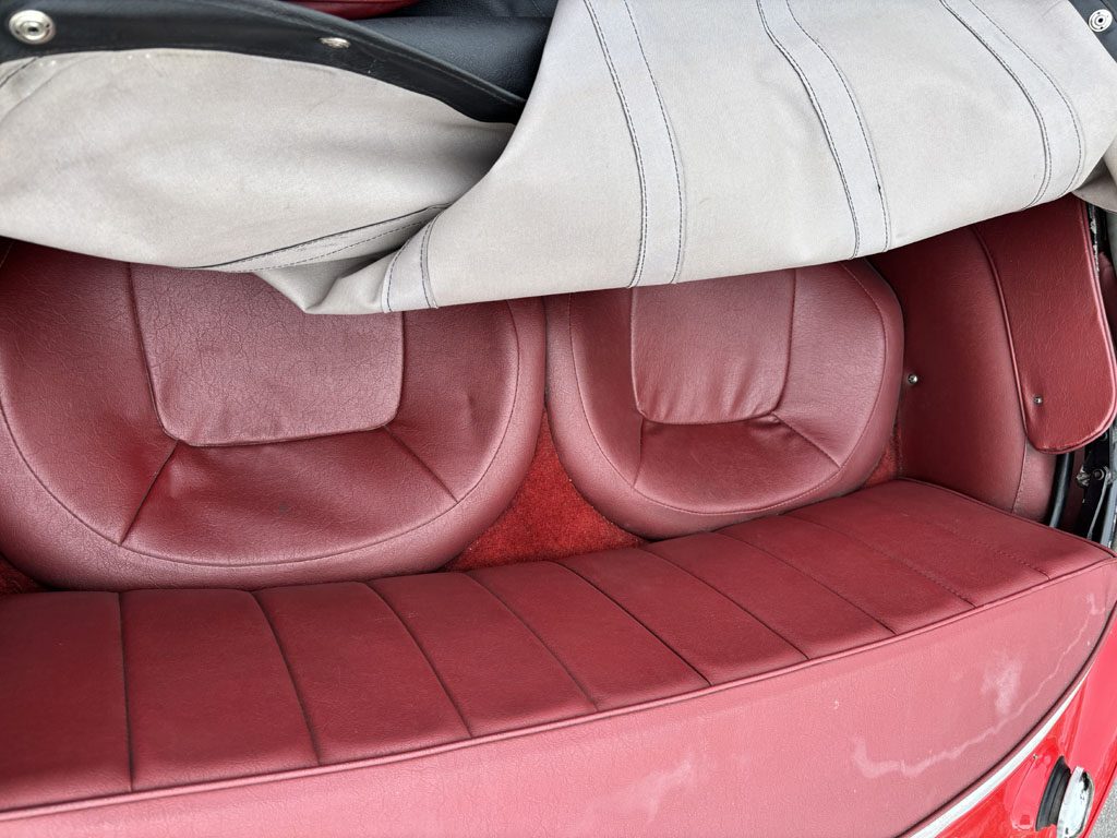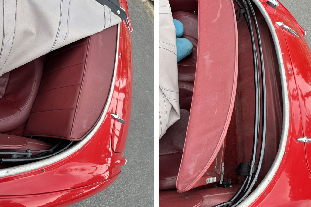 Sur les photos on voit un couvre-tonneau, une toile qui peut recouvrir l’habitacle à l’arrêt sans recapoter en cas de pluie, ou bien qui permet de recouvrir la place passager si vous êtes seul à bord.