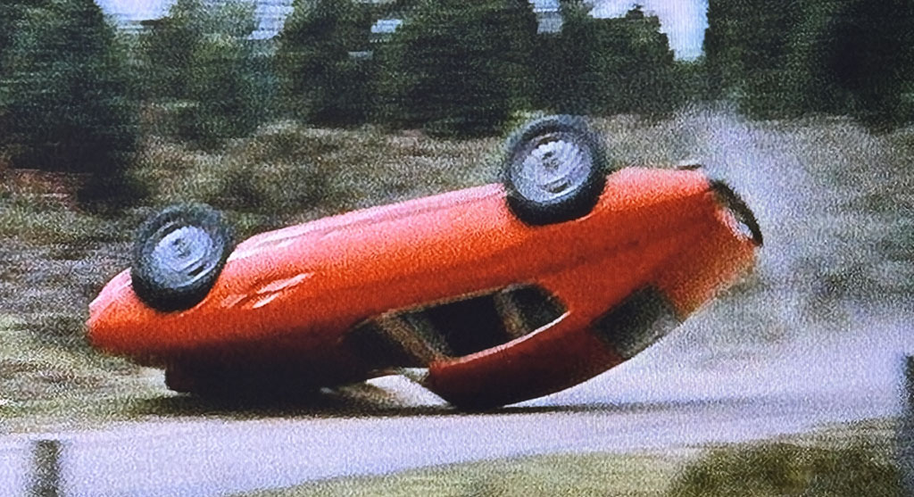 - L’accident de Paul Hawkins en 1965 qui finit dans le port avec sa Lotus à la chicane après le tunnel est reconstitué en plusieurs scènes. C’est d’abord un cascadeur qui fait un tête à queue à ‘l’entrée de la chicane et heurte les rails. Puis on place une fausse Formule 1 avec un mannequin à bord, vraisemblablement équipée d’une fusée à poudre qui la propulse droit dans le port après avoir décollé sur les bottes de paille ! Pour l’anecdote, on raconte que Paul Hawkins était sorti lui-même de sa voiture, avait regagné le bord et était rentré à pied à son stand boire une bière … (source).