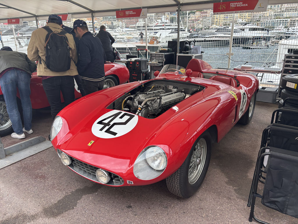 Magnifique duo de Ferrari 750 Monza rutilantes de 1955 : voiture dessinée par Scaglietti, produite de 1953 à 1957, propulsée par des 4 cylindres en ligne double ACT issus de la Formule 1 championne du monde en 1952 et 1953, avec 2 carburateurs Weber. En 1955, elles avaient des 3,4 litres de 280 chevaux. Palmarès étoffé. Les Ferrari Monza SP1 et SP2 de 2019 leur rendent hommage.