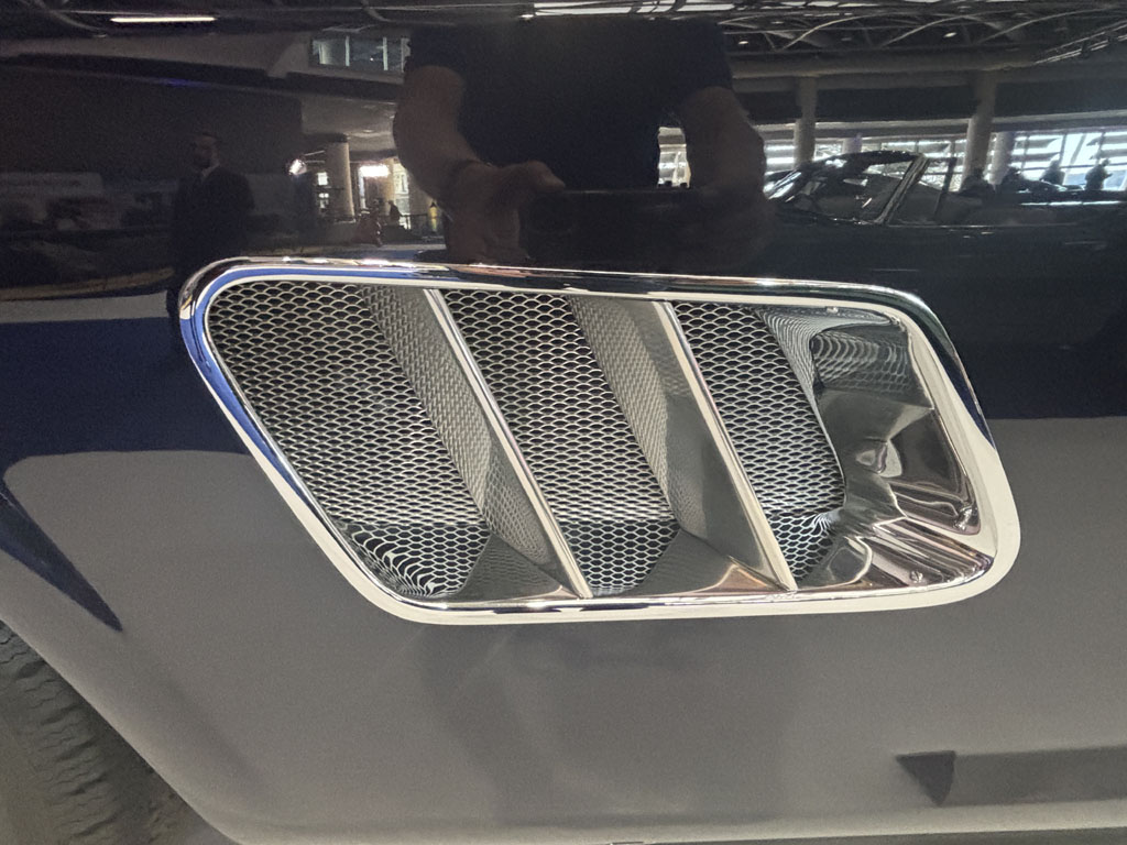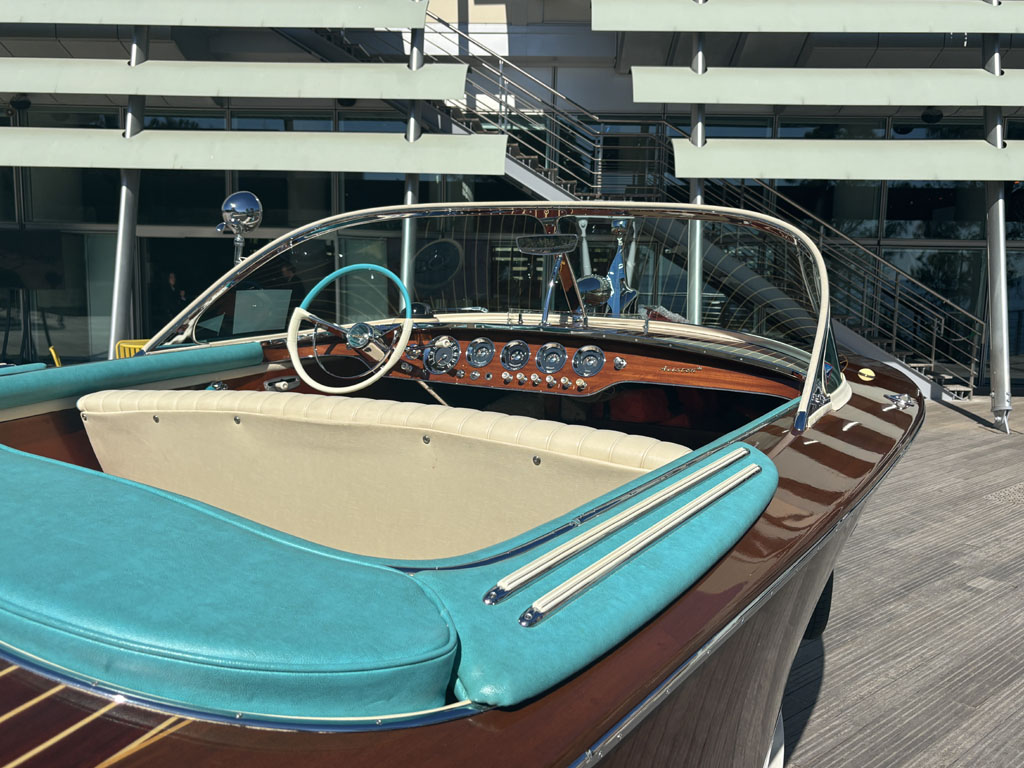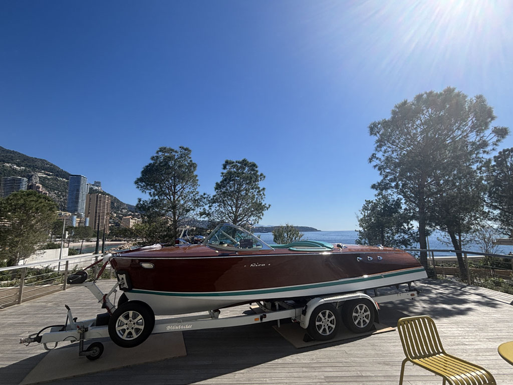 Sur la terrasse face à la mer brillait de tous ses chromes sur sa remorque ce canot Riva Ariston Telstar de 1963 estimé 180-220 K€ (seulement ?). Il est équipé d’un MerCruiser V8 de 260 chevaux. Ce bateau a une belle histoire, trop longue à raconter ici.