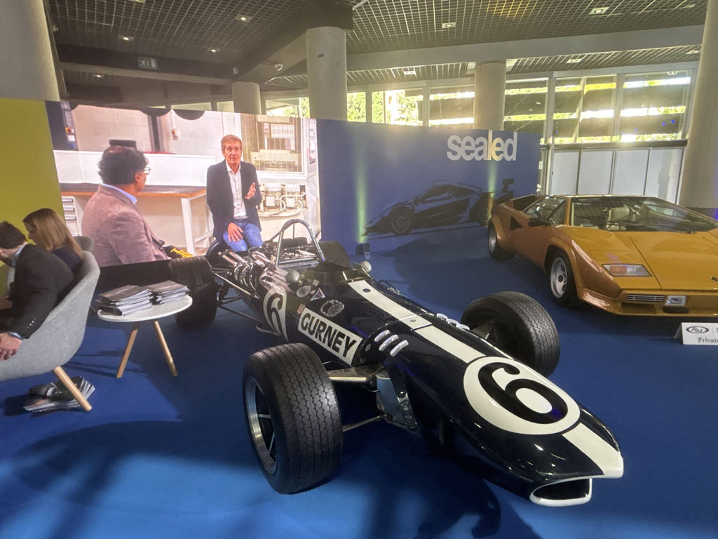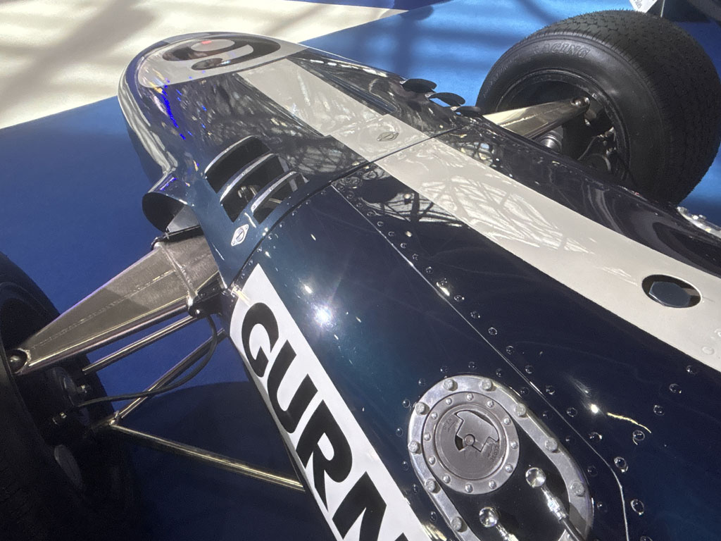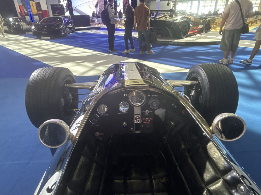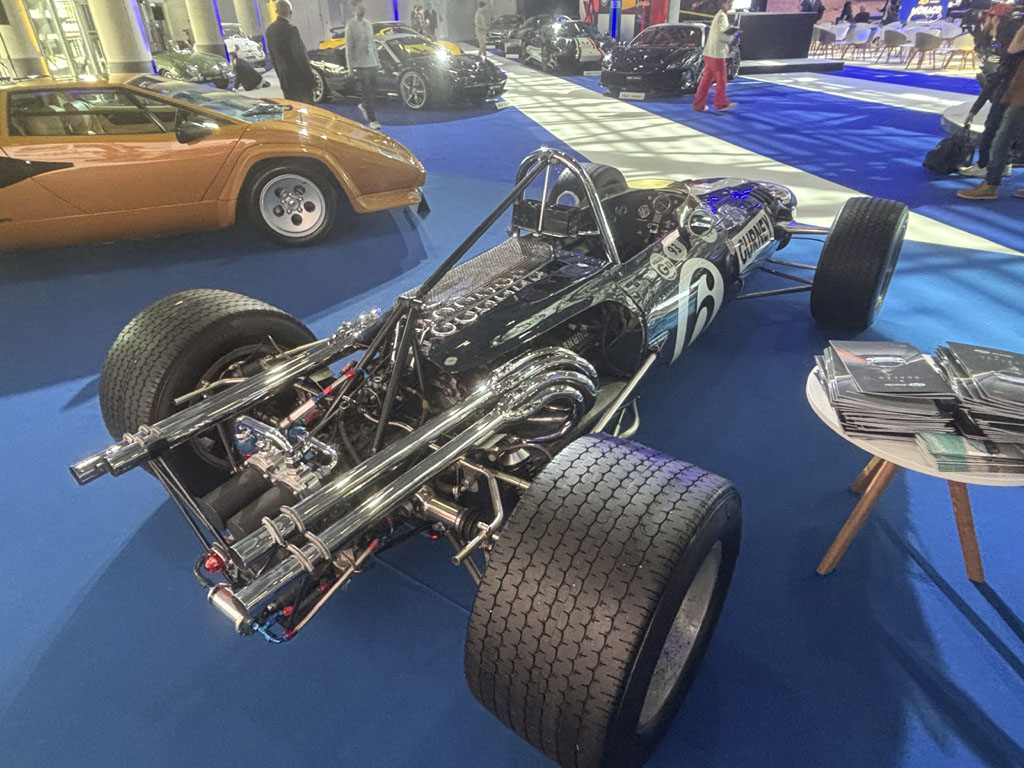 Je me suis longuement attardé sur les chromes de cette Eagle Formule 1 à moteur Weslake V12 de 1967 qui ne figurait pas au catalogue, absolument magnifique avec sa gueule et ses ouïes de squale ! D’autres photos dans le diapo ci-dessus. La marque avait été créée par le pilote américain Dan Gurney qui a gagné le Grand Prix de Belgique 67 avec. Bruit fabuleux parait-il …