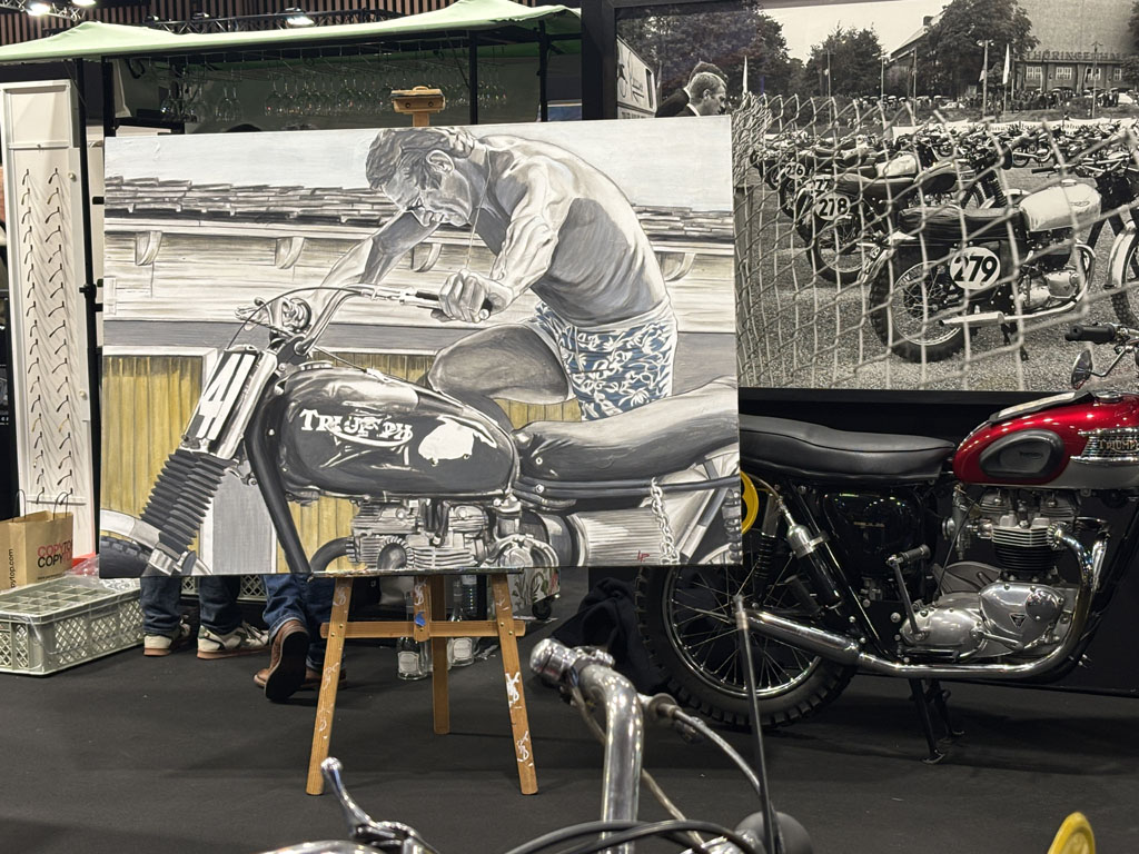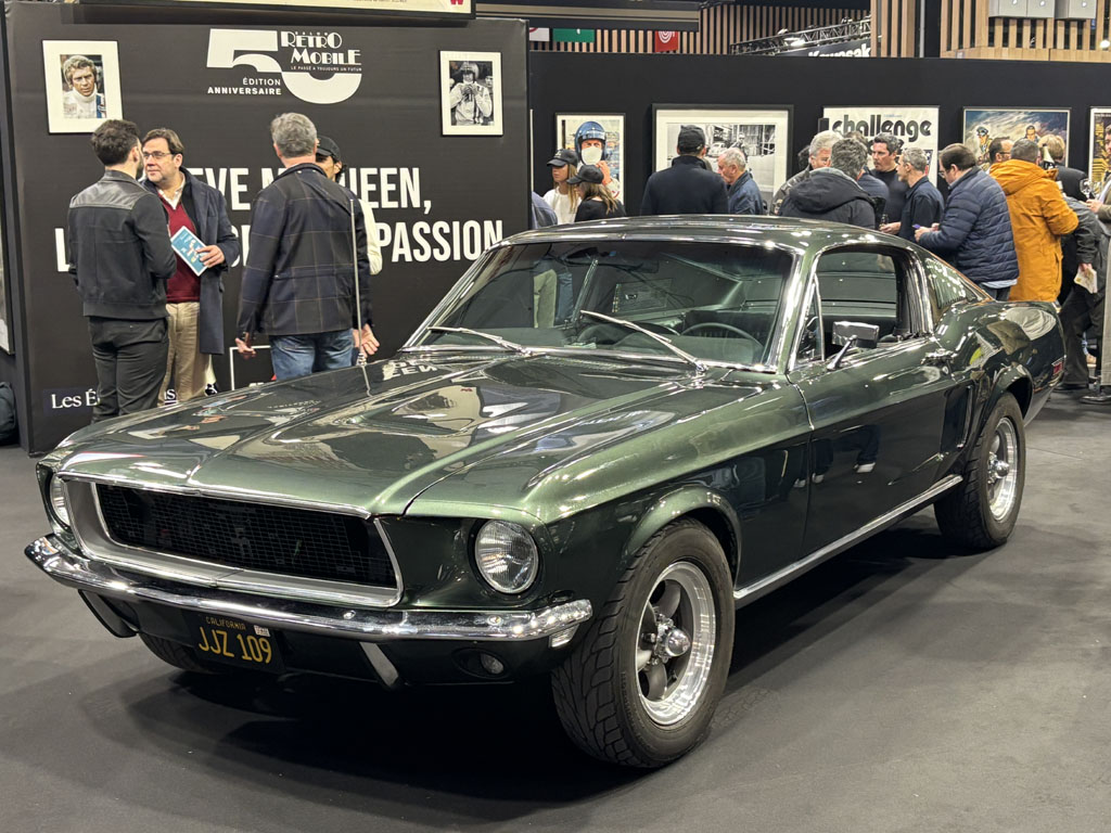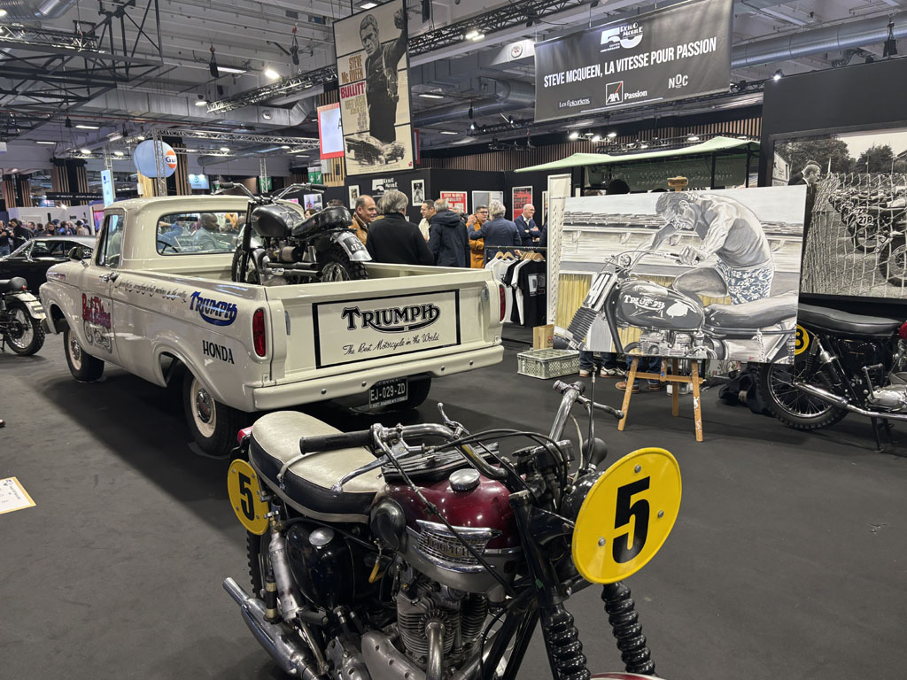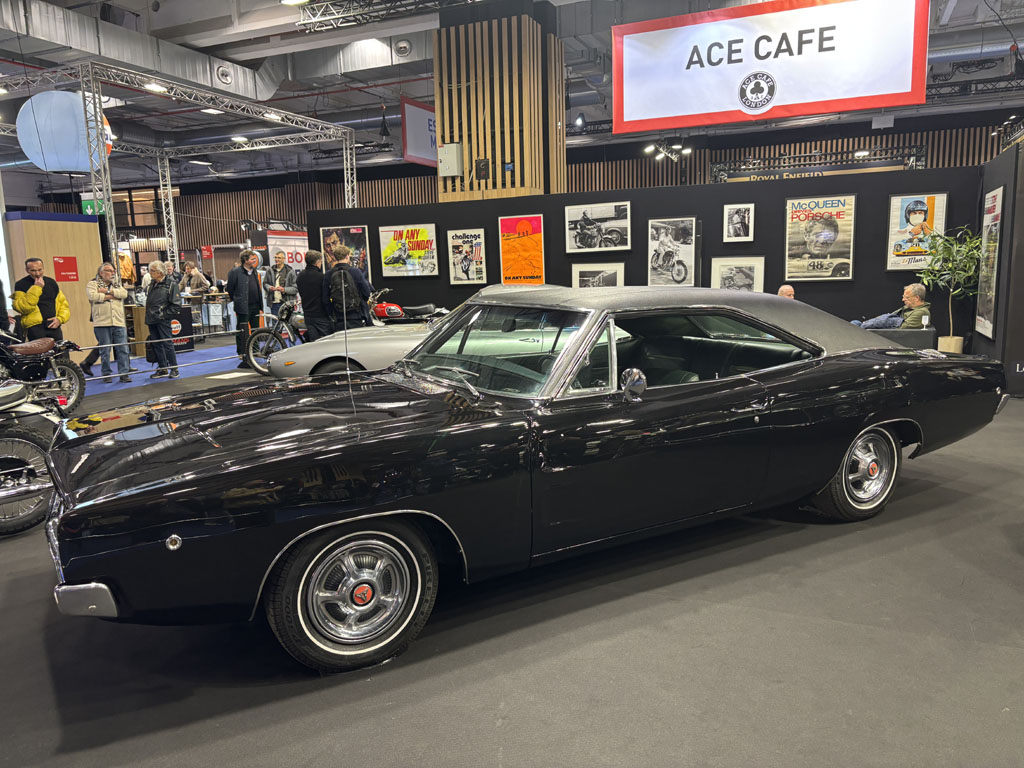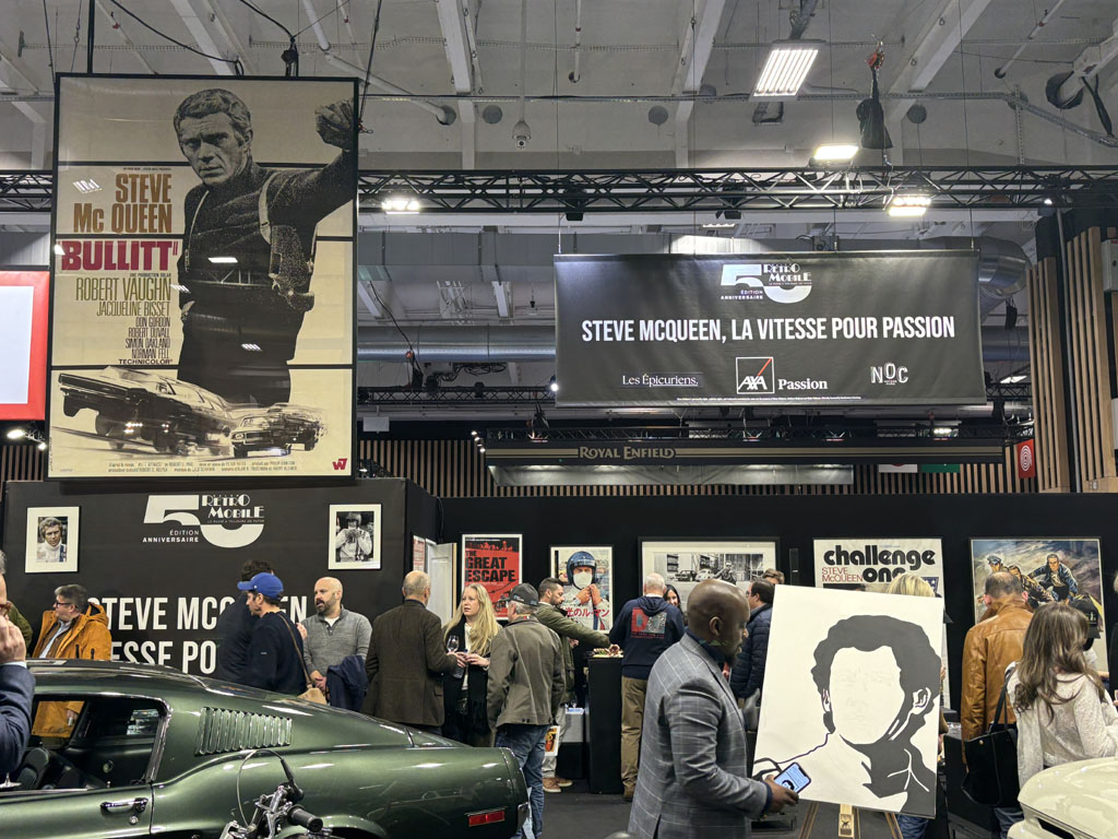 L’ACE café anglais avait rassemblé sur un stand les voitures, motos et souvenirs évoquant Steve Mc Queen. On y retrouvait des copies de la Mustang verte et de la Dodge Charger noire de la poursuite infernale dans San Francisco du film Bullit. Steve était vraiment amateur de sports mécaniques et participait anonymement à des courses d’enduro aux USA à la même époque que moi en France.