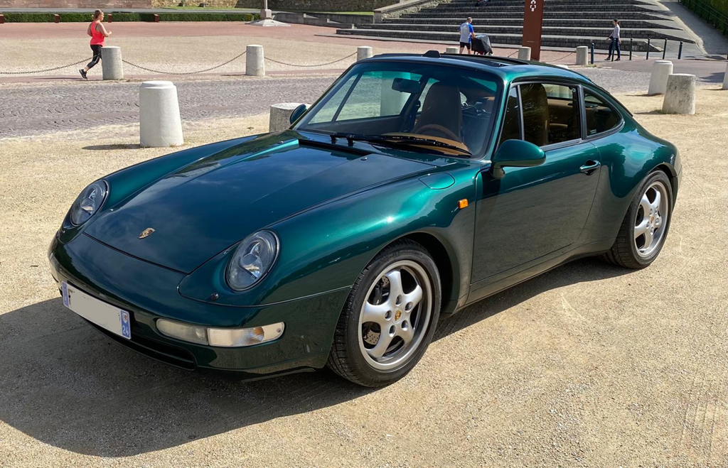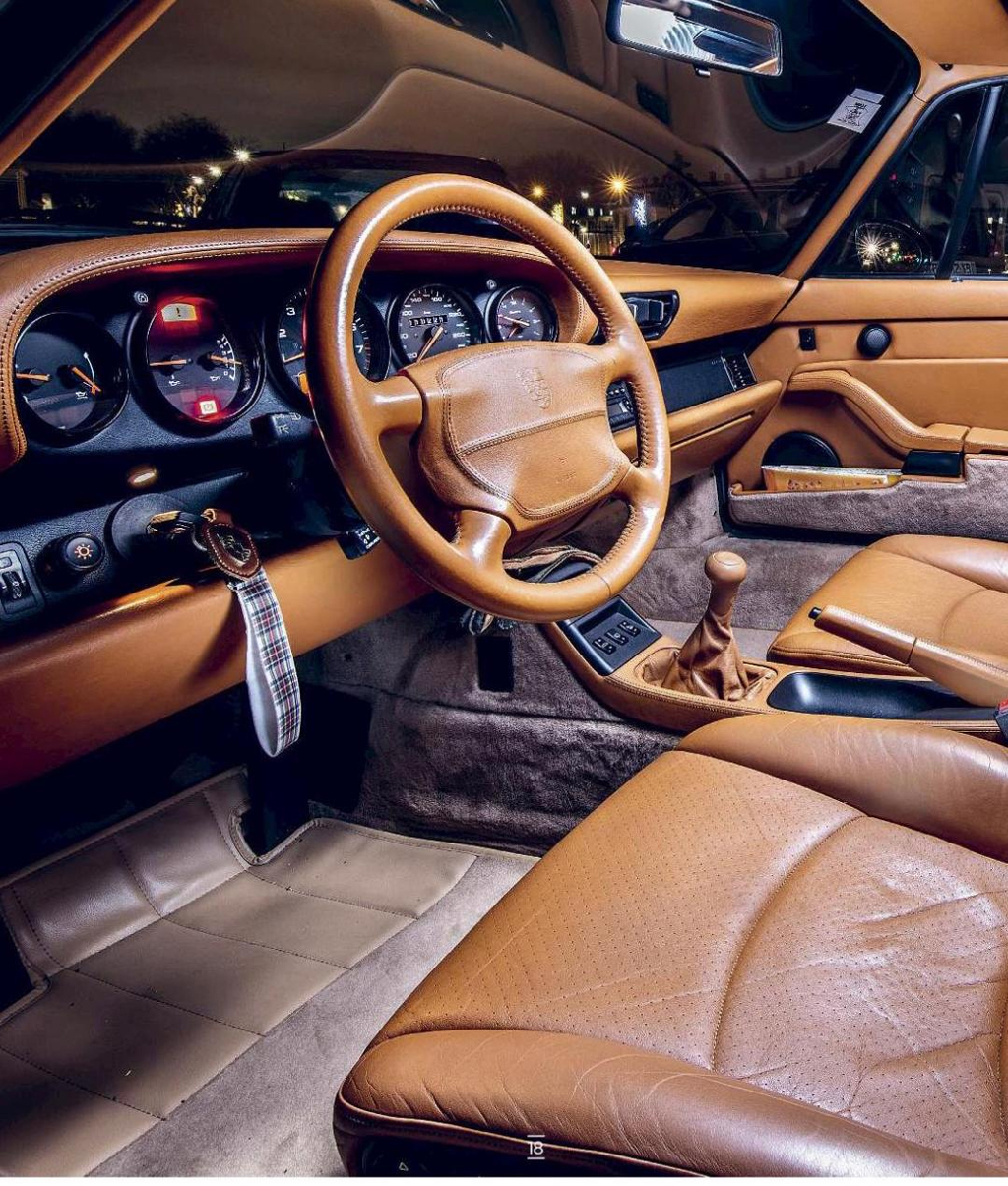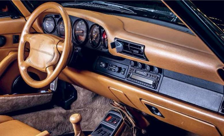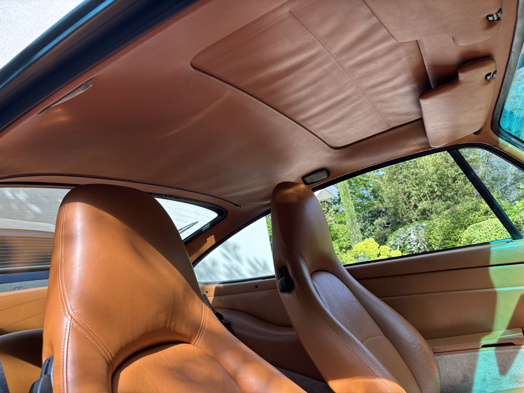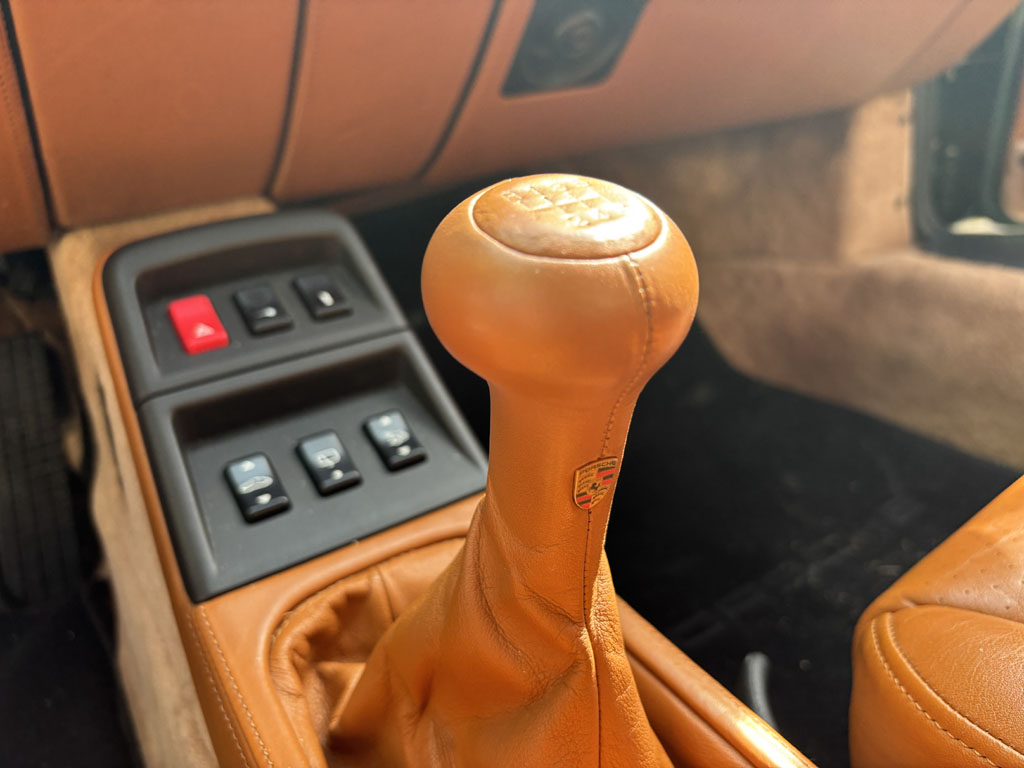 « Porsche l’a conservée à Stuttgart pendant 18 mois, car ils l’ont équipée de tout ce qu’il était possible de monter comme options à l’époque et d’options non encore au catalogue. C’était une voiture test permettant de juger en situation réelle. Par exemple elle a un ciel de toit en cuir. Les pare-soleil sont en cuir, le pommeau de levier de vitesses et son soufflet sont en cuir avec la grille gravée dessus et un écusson Porsche sur la tige. Les portières, le volant, le tableau de bord sont entièrement garnis en cuir fauve (braun dans la nomenclature Porsche, mais un brun clair). La peinture est un vert que Porsche a voulu tester grandeur nature et qui n’est sorti au catalogue qu’en 2000 sur les 996 et 986. »